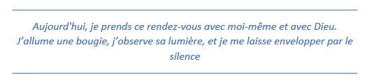 Quelques minutes suffisent pour que ce temps devienne une oasis dans ta journée, un espace où ton âme peut enfin se poser et s'abreuver à la source du silence.